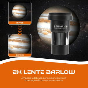 - • A Barlow 2× dobra a ampliação; use quando o seeing permitir boa estabilidade de imagem.