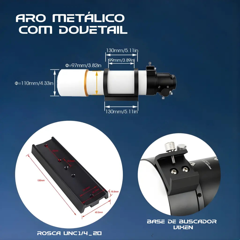 Compatibilidade: Diagonais 1,25"/2", oculares, Barlow, filtros, câmera por adaptadores (visual e registros básicos)